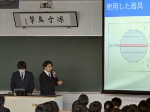 11月15日(土) 岐阜大学を会場として、高文連主催 第34回自然科学系部活動研究発表・交流会が行われました。本校からは2つの研究を出品し、研究論文と口頭発表およびポスター発表の審査を経て、物理分野の「落下する物体の入水時に生じる空気の層の発生条件2」が優秀賞を受賞しました。この研究は来年度行われます第50回全国高等学校総合文化祭あきた総文2026に参加することになりました。もう一つの生物分野「周波数による蚊の行動変化」の研究は、参加生徒の投票で選出された特別賞をいただきました。