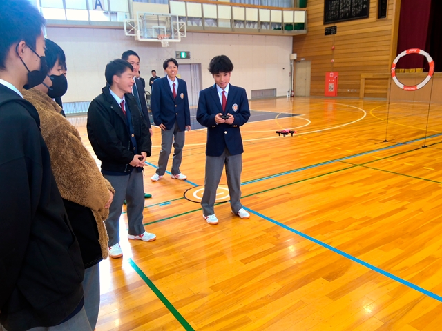 さらに、建設業で活躍するドローンについての説明を受けた後、プログラムドローンの操縦体験にも挑戦。初めての操作に戸惑いながらも、次第にコツをつかみ、笑顔で楽しむ姿が見られました。