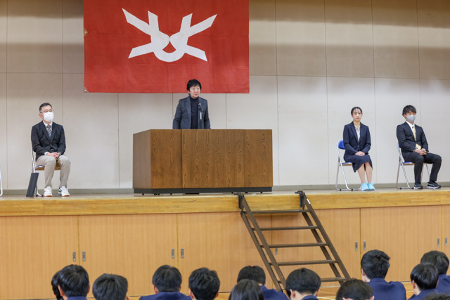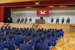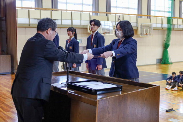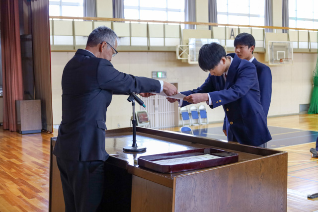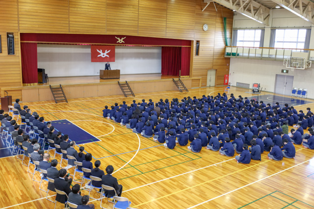 終業式の式辞で校長先生からは、「年度初めの始業式で伝えた3つの目標達成に向けて引き続き努めるように」とお話されました。その後部活動等の表彰を行い、スキー部と電子機械工学科の生徒が表彰されました。