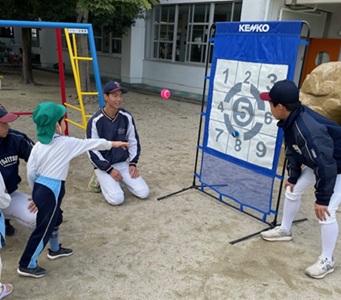 11月4日(火)に硬式野球部の部員が「かわい幼稚園」(可児市)を訪問し、園児を対象に野球の体験教室を実施しました。キャッチボール・スタンドティーバッティング・ストラックアウトの3班に分かれて手解きをしながら野球の体験をしてもらいました。穏やかな天候の中、園児たちも元気よくプレーしてくれました。
