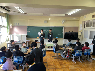 ビジネス情報科プログラミングコース3年生は、12/22(月)と24(水)の両日、上之郷小学校にて「高校生によるプログラミング講座」を開講し、小学3年生から6年生の各学年で2コマずつScratchを使ったプログラミング講座を実施しました。どの学年も同じ指導内容でしたが、たくさんの小学生から「楽しかった」の声をいただきました。Scratchの使い方とアルゴリズムの考え方を、小学生に分かりやすく、楽しく学んでもらうために講座内容を工夫しました。今後も授業の中で得た知識や技術をアウトプットする機会を設け、地域とのふれあいを増やしていきたいと思います。