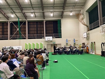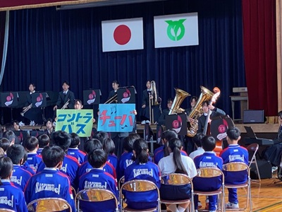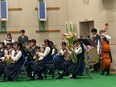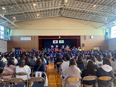 11月15日(土)に坂祝中学校で芸術鑑賞会が開催され、吹奏楽部が演奏させていただきました。坂祝中学校出身の部員が司会を務め、中学校時代の話や東濃実業高校の紹介をはじめ、楽器紹介等を取り入れながら約1時間のステージを進行しました。会場からは手拍子や温かい拍手などをたくさんいただいたり、生徒会長から、部活動を通して一生懸命に頑張ることの大切さを私たちの姿から学んだという言葉をいただいたりして、充実した時間を過ごすことができました。