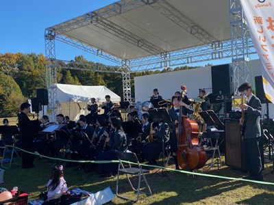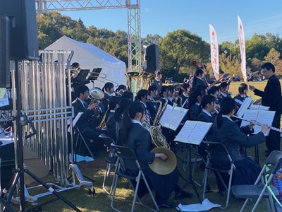 11月15日(土)に、可児市羽崎にあるトイファクトリーの丘(ふれあいパーク・緑の丘)で行われた感謝祭に、吹奏楽部が参加し、野外ステージで演奏させていただきました。天候にも恵まれ、晴天の中でアニメやテレビドラマ等の曲を演奏し、訪れたお客様と一緒に楽しむことができました。
