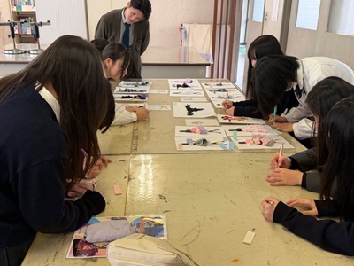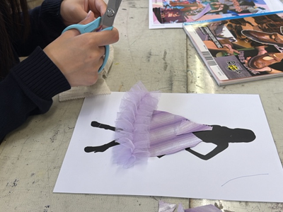 「季節」をテーマに、布や雑誌の切り抜きを使ってコラージュ作品を製作し、生徒一人一人が自由な発想で制作に取り組みました。完成後は作品を鑑賞し合い、それぞれの良さを共有することで、今後のファッションショーに向けたイメージを膨らませる貴重な学びの時間となりました。