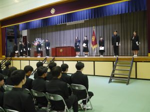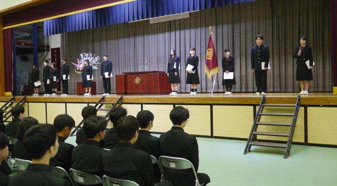 生徒会認証式では、新しく任命された生徒会役員一人ひとりに認証状が手渡され、代表生徒が力強く抱負を述べました。全校生徒が役員の活動に期待を寄せ、よりよい学校づくりへの意識を高める一日となりました。