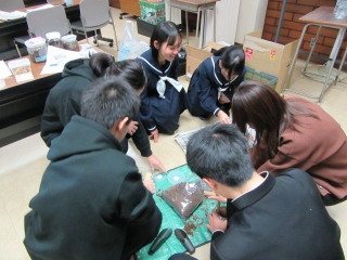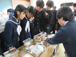 さらに、先生が育ててみえる「ヘラクレスオオカブト」や「ニジイロクワガタ」、「タランチュラ」や「サソリ」、絶滅の恐れがある「ゲンゴロウ」や「タガメ」など外国産や日本の在来種など普段は映像や写真でしか見られないような貴重な生物を、直接見たり触れたりして生徒は学んだようです。