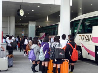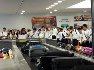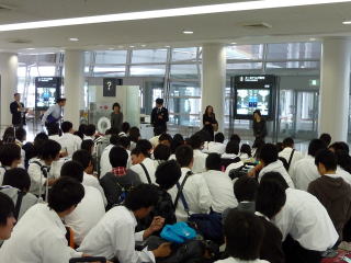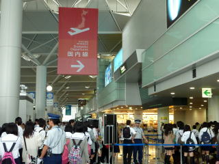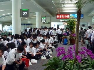 中部国際空港での風景です、生徒たちは岐阜と沖縄の温度差の調整のために上着を羽織っています。