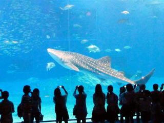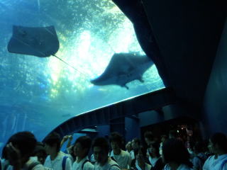 美ら海水族館では、ジンベイザメとマンタが生徒たちを出迎えてくれました。