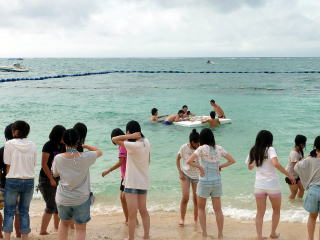 3日目の午後は、全員恩納村のムーンビーチへ出て、沖縄の海の雰囲気を味わった後、マリン体験をする者と、むら咲きむらで体験学習をする者に分かれました。